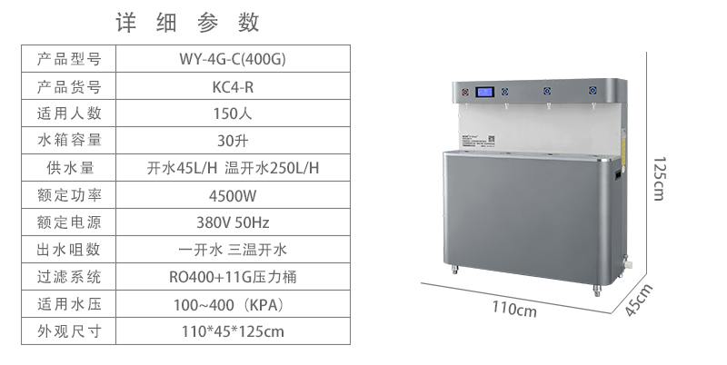 型号:WY-4G-C尺码:110x40x125cm过滤系统:聚丙烯纤维滤芯+活性炭+超滤用户数目:150人水箱容量:30升供水:沸水45l/h热水250l/h额定功率:4500w电源:380v50hz出水口号码:一开水和三开水适用水压:100-400(KPA)