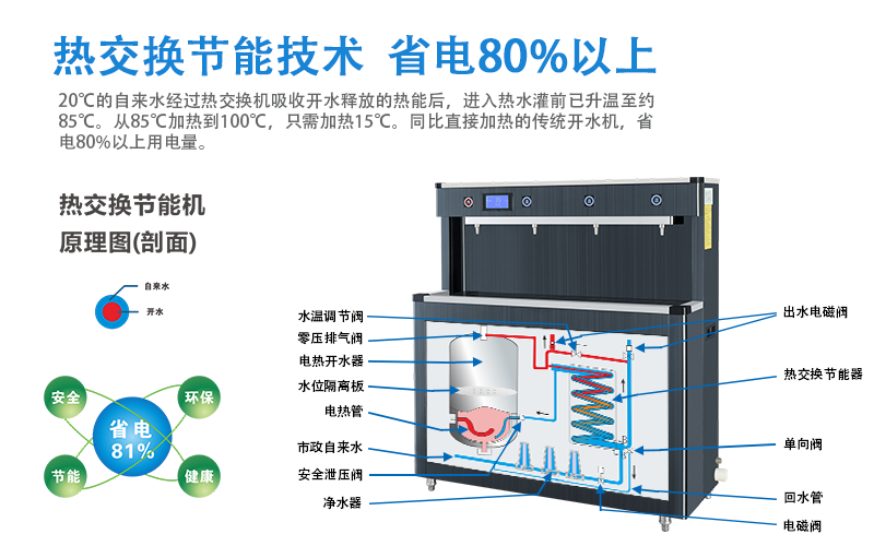 采用国际优质阻燃聚氨酯保温材料,高效下一代专利换热,防止蒸汽溢出,回收蒸汽热能;在相同的条件和节能的情形下,测得的耗电量比平常开水器少60%;(确保纯净的水质,无异味,配有加热和排空设备。加热时,水中特有的味道和微量危害离子与蒸汽全然排出。冷水通过热交换吸收蒸汽的热量。自来水在进入水箱之前不需要用电,可以上升15度到25度。确保出水温度不最低97℃。